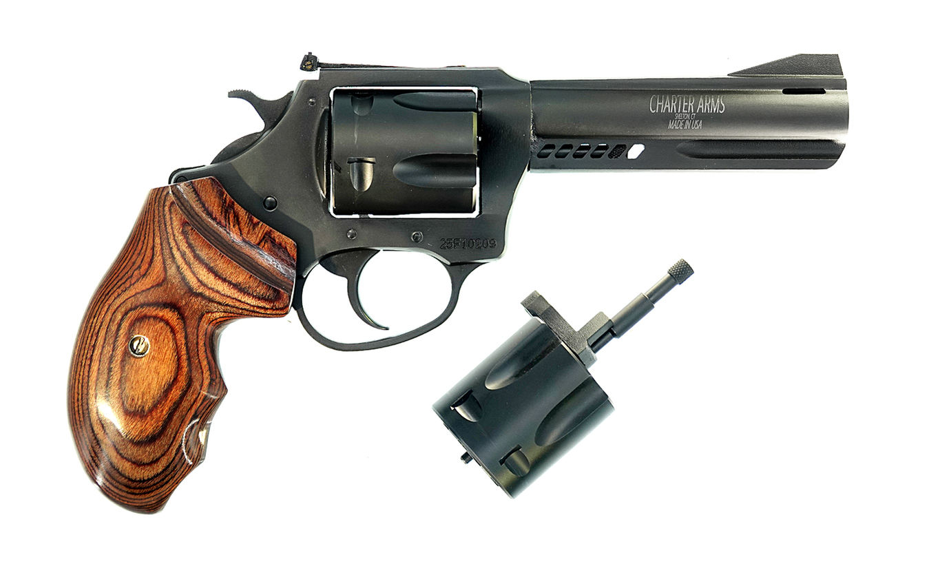 This one gives the best of both worlds. The Double Dog is equppied with a ported barrel with stylish diamond cuts. The Charter Arms® Mag Pug® revolver is second to none for personal protection. Its ergonomic, hand-filling, sleek walnut grip helps minimize recoil and muzzle rise for maximum control. While the ported .357 Magnum chambering delivers "magnum force" on target. And if you prefer to carry a different cartridge the next day, no problem! With just one crane screw washer you can switch to our 9MM Pit Bull® cylinder that comes with the firearm.